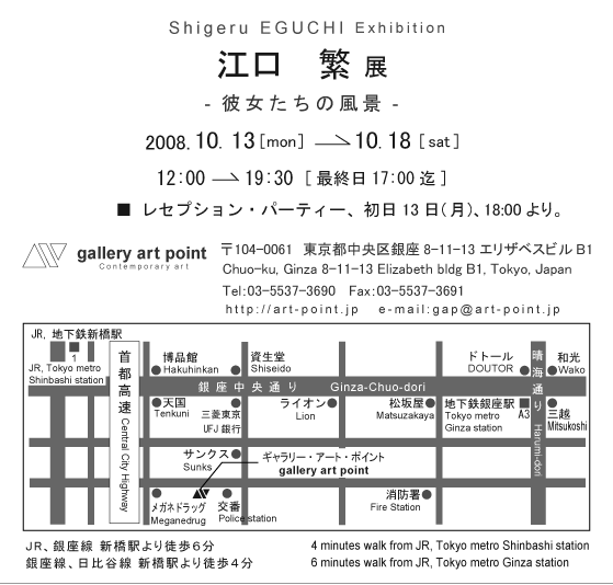 ■ - 彼女たちの風景 - Shigeru Eguchi Exhibition 期間:10/13[mon]〜10/18[sat] 時間:12:00〜19:30(最終日17:00まで) 場所:galley art point http://art-point.jp ※レセプション・パーティー:初日13日(月)18:00より